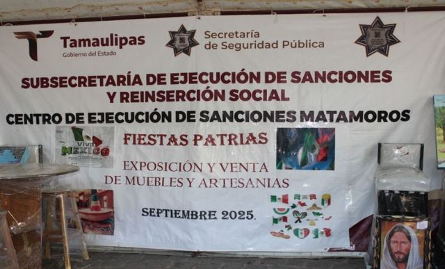 Matamoros, Tamaulipas (13-Septiembre-2025).- En el marco de las fiestas patrias, el Centro de Ejecución de Sanciones (CEDES) en el municipio de Matamoros instaló un módulo de exposición y venta de productos elaborados por personas privadas de la libertad (PPLs).