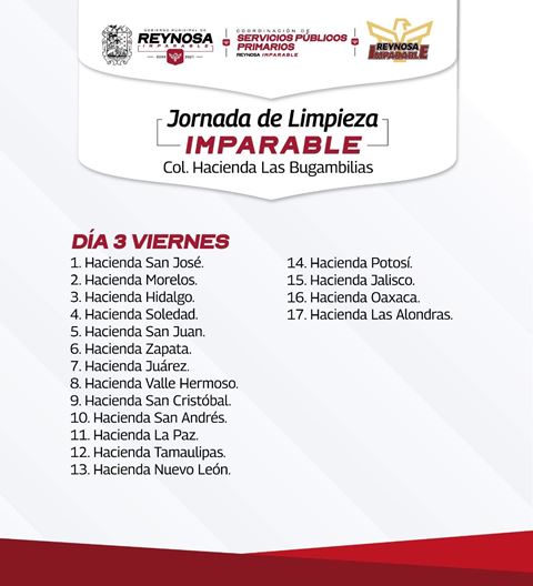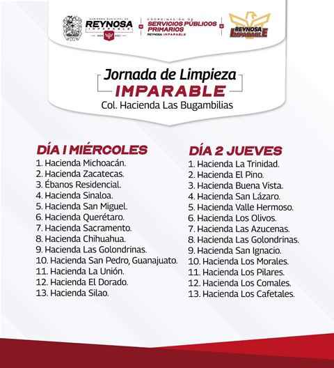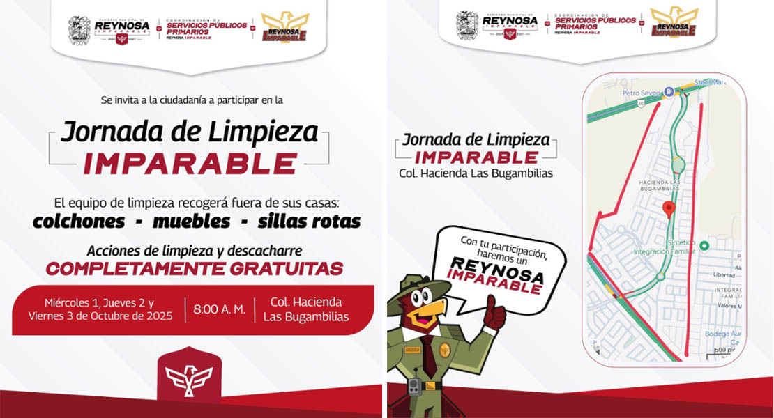 Reynosa, Tam (30-Septiembre-2025).- El Presidente Carlos Peña Ortiz programó para las familias de la colonia Hacienda Las Bugambilias la Jornada de Limpieza Imparable durante los días miércoles 1, jueves 2 y viernes 3 de octubre, un servicio gratuito que incluye la recolección de sillas, colchones, muebles inservibles en general.