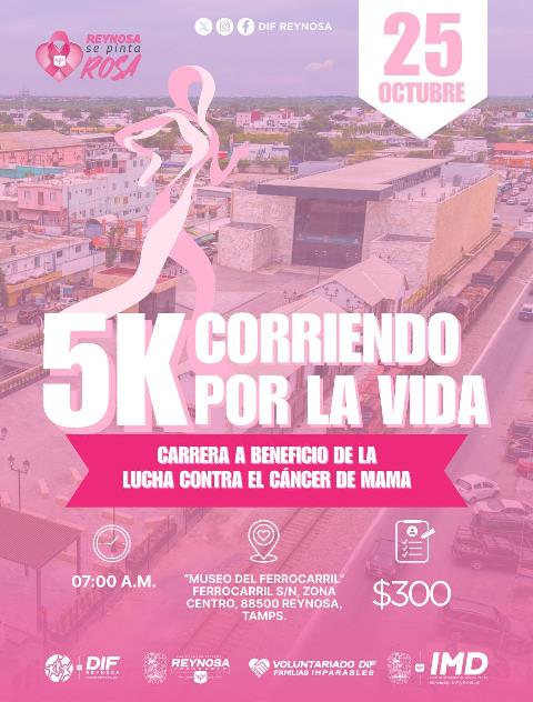 Reynosa, Tam (1-Octubre-2025).- Participa en la «5K Corriendo por la Vida», y sé parte de la Lucha Contra el Cáncer de Mama; el Alcalde Carlos Peña Ortiz y la Presidenta del Voluntariado DIF-Reynosa, Alejandra Yelitza Garza, te invitan a esta competencia con causa el día 25 de octubre.