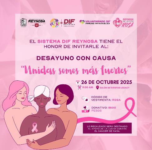 Reynosa, Tam (4-Octubre-2025).- El Sistema DIF-Reynosa, que preside Carlos Luis Peña Garza y el Voluntariado que encabeza Alejandra Yelitza Garza, invita a la ciudadanía a sumarse al Desayuno con Causa “Unidas Somos Más Fuertes”, evento que se llevará a cabo el próximo 26 de octubre de 2025 a las 9:00 de la mañana en el Salón de Eventos Legacy.
