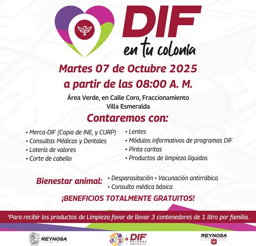 Reynosa, Tam (5-Octubre-2025).- Por instrucciones del Alcalde, Carlos Peña Ortiz, el Sistema DIF-Reynosa que preside Carlos Luis Peña Garza, llevará una nueva brigada del programa “DIF en Tu Colonia” al fraccionamiento Villa Esmeralda, este martes 7 de octubre, a partir de las 8:00 de la mañana, en el área verde ubicada sobre la calle Coro.