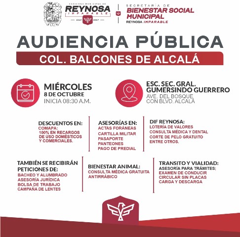 Reynosa, Tam (6-Octubre-2025).- El Alcalde Carlos Peña Ortiz pondrá a disposición de las familias de Balcones de Alcalá, todos los servicios del Ayuntamiento, de sus dependencias, del DIF-Reynosa, la COMAPA y del IRCA en la Audiencia Pública del próximo miércoles 8 de octubre a partir de las 8:30 de la mañana.