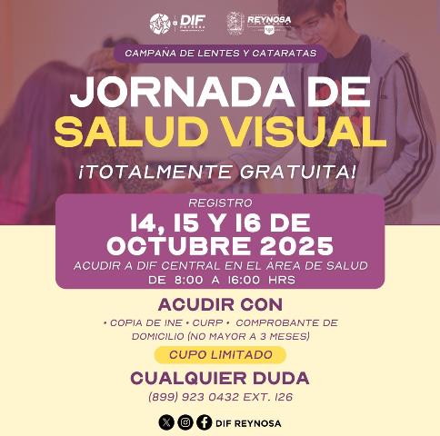 Reynosa, Tam (8-Octubre-2025).- Con el objetivo de seguir mejorando la salud visual de la población más vulnerable, el Sistema DIF-Reynosa que preside Carlos Luis Peña Garza, convoca a la ciudadanía a participar en la Jornada de Salud Visual, para beneficiar a las familias con revisión de la vista, lentes y operaciones de Cataratas, donde médicos especialistas del Hospital La Carlota de Montemorelos, Nuevo León ofrecerán valoraciones oftalmológicas totalmente gratuitas.