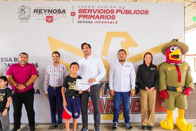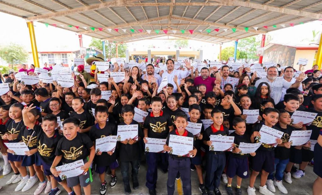 Reynosa, Tam (8-Octubre-2025).- «El día de hoy ya son Guardianes del Orden, aprendieron a cuidar el medio ambiente, no tirar basura; todo eso es importante para nuestra ciudad, debemos evitar que haya quien tire basura en lugares clandestinos porque debe ir en el basurero o el contenedor, gracias por ayudar», dijo el Alcalde a la emocionada comunidad escolar de la Primaria Moctezuma.