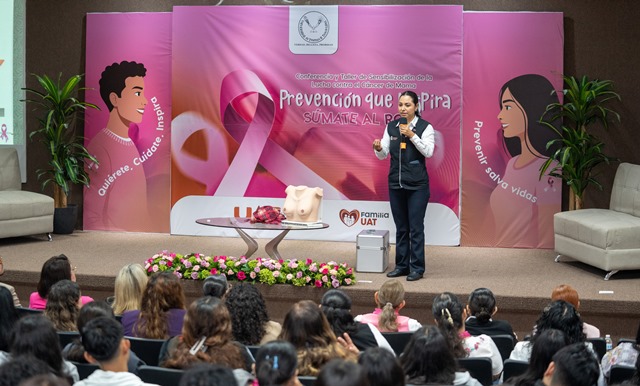 Ciudad Victoria, Tam (9-Octubre-2025).- La Universidad Autónoma de Tamaulipas, a través de Familia UAT, llevó a cabo la conferencia y taller de sensibilización de la lucha contra el cáncer de mama “Prevención que inspira, súmate al rosa”, con el propósito de promover la conciencia sobre la detección oportuna y fortalecer la cultura de la prevención en la comunidad universitaria.