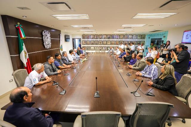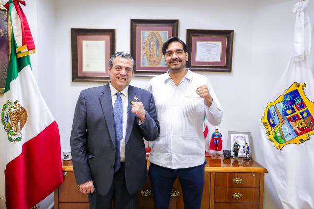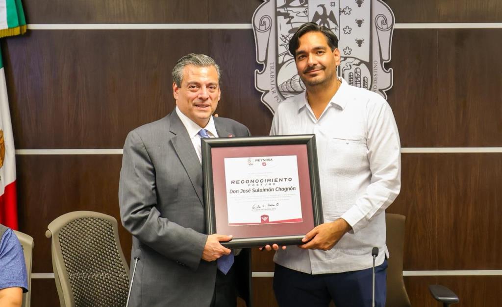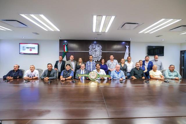 Reynosa, Tam (10-Octubre-2025).- El Presidente Municipal Carlos Peña Ortiz entregó al Presidente del WBC, Consejo Mundial del Boxeo, Mauricio Sulaimán Saldivar, un reconocimiento póstumo dedicado al Expresidente José Sulaimán Chagnón, en una reunión en la que participaron integrantes del Cabildo de Reynosa y ex boxeadores mexicanos que dieron la gloria internacional a este deporte.