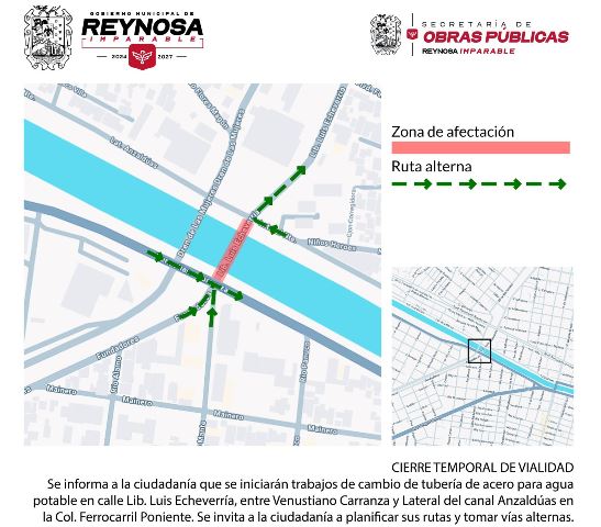 Reynosa, Tam (11-Octubre-2025).- El Gobierno Municipal y la COMAPA de Reynosa informan que el próximo lunes 13 de octubre se iniciarán el trabajo de cambio de tubería de acero para agua potable en el libramiento Luis Echeverría, entre Venustiano Carranza y lateral del canal Anzaldúas, en la colonia Ferrocarril Poniente.