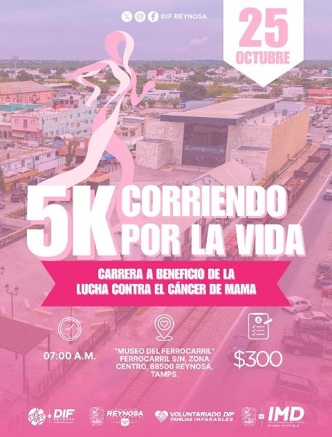 Reynosa, Tam (12-Octubre-2025).- El Sistema DIF-Reynosa que encabeza Carlos Luis Peña Garza, invita a agrupaciones, corredores y a toda la ciudadanía a participar en la Carrera 5K “Corriendo por la Vida”, una actividad que combina deporte, solidaridad y conciencia social, en el marco de la lucha contra el cáncer de mama.
