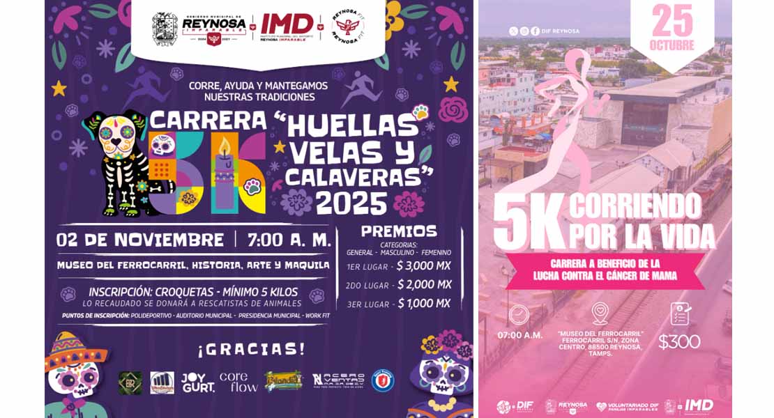 La primera es la Carrera Corriendo por la Vida, organizada por el DIF Reynosa, en apoyo a la lucha contra el cáncer de mama, mientras que la segunda es la de Huellas, Velas y Calaveras, que tiene como propósito recaudar alimento para beneficiar a los centros de rescate animal de la ciudad.
