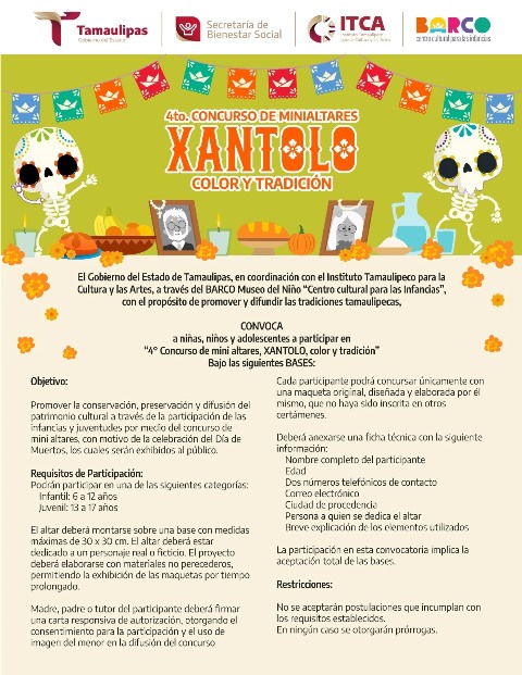 Tampico, Tamaulipas (20-Octubre-2025).- Para conmemorar el Día de Muertos, una de las celebraciones más emblemáticas de México; el Gobierno del Estado de Tamaulipas, a través del Instituto Tamaulipeco para la Cultura y las Artes y el centro cultural para las infancias BARCO, llevará a cabo una jornada de actividades culturales, artísticas y familiares en el sur del estado, por lo que invitan a las comunidades de Tampico y municipios cercanos a participar en las diversas actividades como el Concurso de Mini Altares.