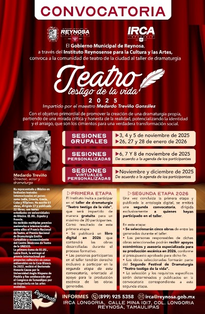 Reynosa, Tam (21-Octubre-2025).- El Gobierno de Reynosa, que preside el Alcalde Carlos Peña Ortiz, invita a creadores teatrales a participar en el Taller gratuito “Teatro, testigo de la vida” 2025, impartido por el Maestro tamaulipeco Medardo Treviño González.
