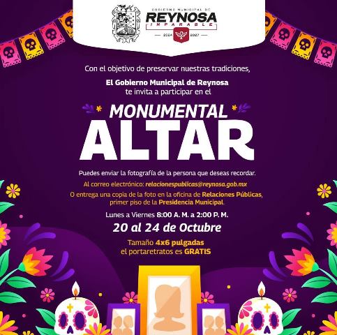 Reynosa, Tam (21-Octubre-2025).- El Presidente Municipal Carlos Peña Ortiz invita a la comunidad a ser parte de la preservación de las tradiciones nacionales, en el Monumental Altar, de la plaza principal Miguel Hidalgo de Reynosa, con el que se celebra a quienes ya no están físicamente con nosotros.