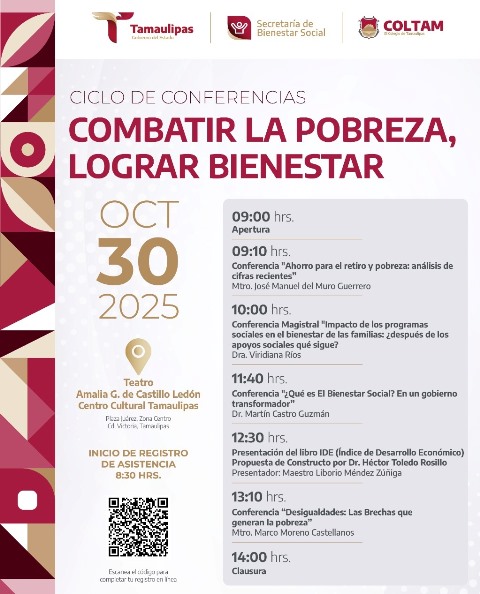 Ciudad Victoria, Tamaulipas (23-Octubre-2025).- El Gobierno del Estado a través de la Secretaría de Bienestar Social y el Colegio de Tamaulipas, organizan el ciclo de conferencias “Combatir la Pobreza, Lograr Bienestar”, que se desarrollará el 31 de octubre en el Teatro Amalia G. de Castillo Ledón, a partir de las 9:00 horas.