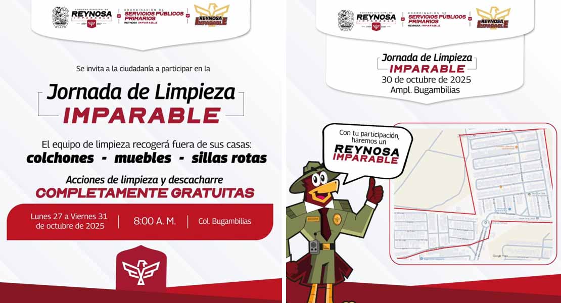REYNOSA, TAM (29-Octubre-2025).- El Gobierno de Reynosa que encabeza Carlos Peña Ortiz, a través de la Coordinación General de Servicios Públicos Primarios, invita a la ciudadanía a participar en esta gran campaña de limpieza y descacharre en tu colonia 🧹