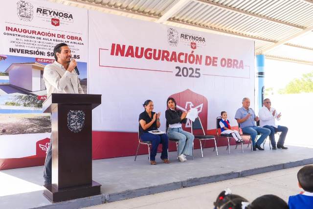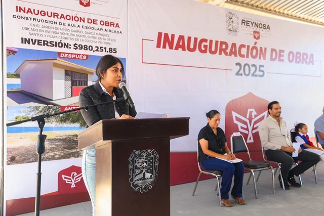 Reynosa, Tam (29-Octubre-2025).- La Maestra Vilma Patricia Martínez Tavares, Encargada del jardín de niños Gabriel García Márquez, recibió al Presidente Municipal Carlos Peña Ortiz, «hoy es un día muy especial para nuestra comunidad escolar ya que celebramos la entrega de una nueva Aula, que representa crecimiento, oportunidad y esperanza para nuestros alumnos».
