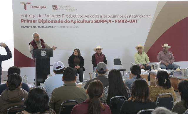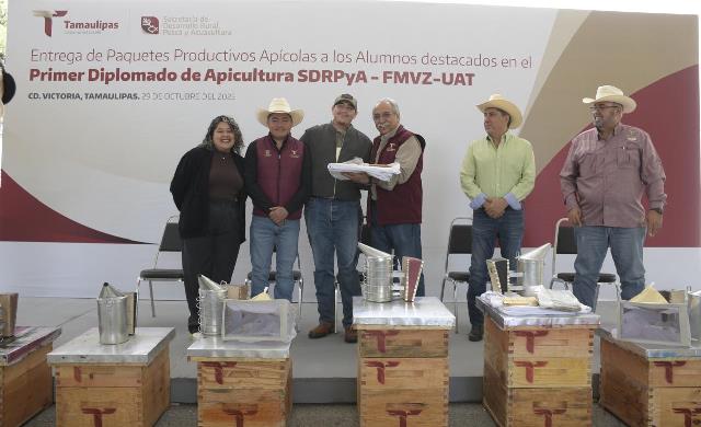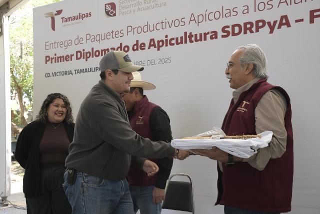 Ciudad Victoria, Tamaulipas (29-Octubre-2025).- Como parte del programa Fomento a la Apicultura, la Secretaría de Desarrollo Rural, Pesca y Acuacultura del Gobierno del Estado de Tamaulipas, en coordinación con la Facultad de Medicina Veterinaria y Zootecnia (FMVZ) de la Universidad Autónoma de Tamaulipas (UAT), llevó a cabo la entrega de colmenas a los alumnos destacados del 1er Diplomado de Apicultura, realizado de marzo a junio de 2024.