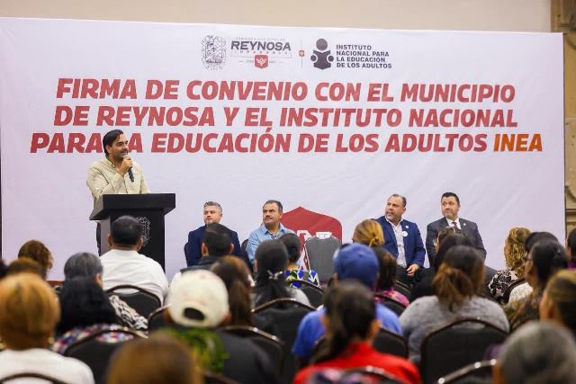 Reynosa, Tam (30-Octubre-2025).- «Para poder combatir la pobreza, lo fundamental es la educación del pueblo de México», aseguró el Presidente Municipal Carlos Peña Ortiz al firmar un convenio con el Instituto Nacional para la Educación de los Adultos, INEA, representado por su Director General, Armando Contreras Castillo.