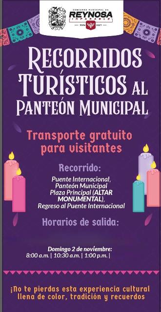 Reynosa, Tam (1-Noviembre-2025).- El Presidente Municipal Carlos Peña Ortiz invita a los residentes del Valle del Sur de Texas a disfrutar de los Recorridos Turísticos al Panteón Municipal; el transporte gratuito para visitantes estará disponible este domingo 2 de noviembre en el Puente Internacional Benito Juárez, -cruce Reynosa-Hidalgo-, desde las 8:00 de la mañana.