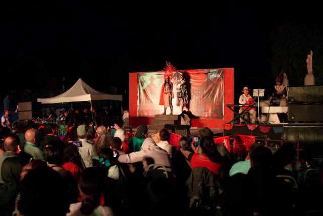 Mientras tanto, en el Antiguo Panteón Municipal, decenas de personas se reunieron para presenciar una destacada puesta en escena de la Compañía de Teatro “Adolfo López Mateos”, así como la presentación del Grupo de Danza del CBTIS 137, que llenó el escenario de colorido folclor y energía.