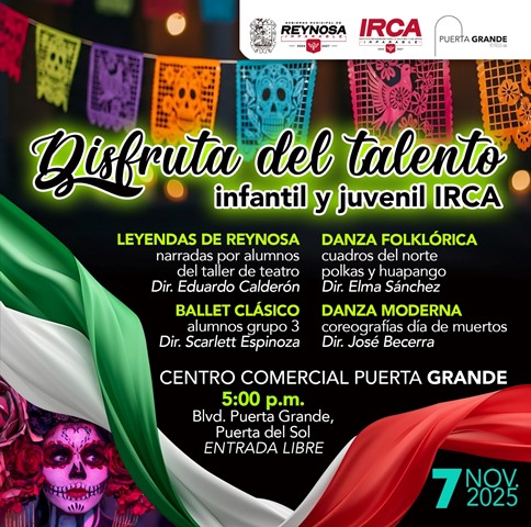 Reynosa, Tam (5-Noviembre-2025).- El Gobierno de Reynosa, que preside Carlos Peña Ortiz, invita al público a disfrutar de una muestra artística protagonizada por niñas, niños y jóvenes del Instituto Reynosense para la Cultura y las Artes, IRCA, el próximo viernes 7 de noviembre a las 5:00 P. M. en el centro comercial Puerta Grande, con entrada libre.