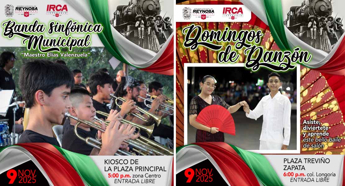 Reynosa, Tam (6-Noviembre-2025).- Atendiendo las indicaciones del Presidente Municipal Carlos Peña Ortiz, el Instituto Reynosense para la Cultura y las Artes extiende una invitación a la ciudadanía para asistir a las actividades artísticas gratuitas programadas para este domingo 9 de noviembre.