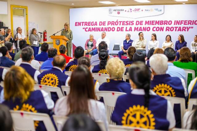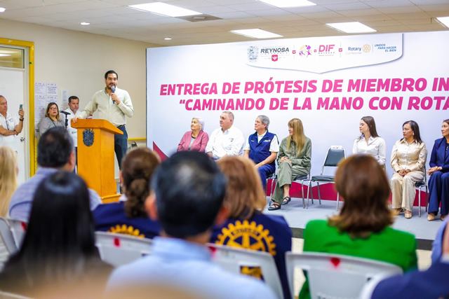 Reynosa, Tam (7-Noviembre-2025).- El Alcalde Carlos Peña Ortiz encabezó la entrega de prótesis inferiores a reynosenses que lo necesitaban, marcando el inicio de una nueva etapa en la vida de estas personas, un acto en el que estuvo acompañado por el Presidente del Club Rotario Reynosa, Marcos Olivares Olvera, por la Senadora Maki Esther Ortiz Domínguez; el Presidente del Patronato del DIF-Reynosa, Carlos Luis Peña Garza y por la Presidenta del Voluntariado DIF-Reynosa, Alejandra Yelitza Garza.