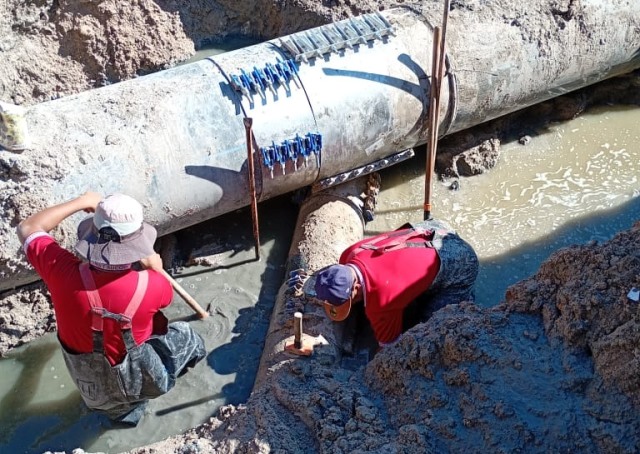 En esta ocasión, personal del área de Aguas Residuales llevó a cabo la instalación de abrazaderas y tubería en el emisor sanitario ubicado sobre la calle Calandrias, en la colonia Manuel Tárrega, con el propósito de solucionar el problema de fugas de aguas residuales que afectaba a los vecinos y de esta manera mejorar la infraestructura sanitaria del sector.