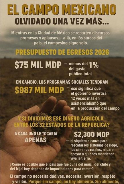 La paradoja es brutal: un gobierno que se proclama de transformación ha terminado por consolidar el viejo modelo de dominación, donde el campesino agradece el subsidio en lugar de exigir un mercado justo. La justicia rural no se logra con limosnas, sino con productividad, organización y conocimiento. Ninguna sociedad se emancipa repartiendo dádivas. La soberanía no se alcanza con discursos, sino con inversión, tecnología e inteligencia pública. La autosuficiencia de la que se presume no es más que un reflejo en el desierto: un espejismo que se evapora frente a la realidad de un campo agotado y de un Estado que ha olvidado su deber más elemental: producir para vivir con dignidad.