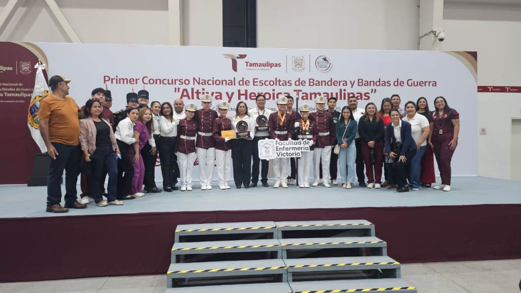 Ciudad Victoria, Tam (8-Noviembre-2025).- Con gran orgullo institucional, la Facultad de Enfermería Victoria de la Universidad Autónoma de Tamaulipas (UAT) obtuvo el primer lugar en las categorías Nivel Superior y Libre del Primer Concurso Nacional de Bandas de Guerra y Escoltas de Bandera “Altiva y Heroica Tamaulipas”, organizado por el Gobierno del Estado y celebrado este 8 de noviembre en el Polyforum de Ciudad Victoria.
