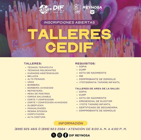 Reynosa, Tam (9-Noviembre-2025).- A fin de impulsar el aprendizaje y el emprendimiento, el Sistema DIF-Reynosa, que preside Carlos Luis Peña Garza, invita a la ciudadanía a formar parte de los talleres CEDIF.