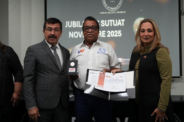 Ciudad Victoria, Tam (9-Noviembre-2025).- El rector Dámaso Anaya Alvarado presidió la entrega de reconocimientos a las y los jubilados del Sindicato Único de Trabajadores de la Universidad Autónoma de Tamaulipas (SUTUAT), a quienes agradeció por todos los años de esfuerzo y dedicación al servicio de la casa de estudios.