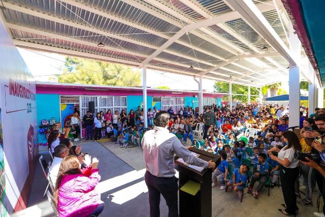 «Mi nombre es Tiago Daniel, gracias en nombre de mis compañeros y Maestras al Presidente por regalarnos esta techumbre bonita. Gracias por pensar en nosotros y por ayudarnos a tener un lugar donde podemos jugar, aprender, y convivir sin sol, sin mojarnos con la lluvia. Estamos muy felices de tener un Presidente que se preocupe por los niños y niñas, que son el futuro de esta ciudad», dijo el alumno de kinder.