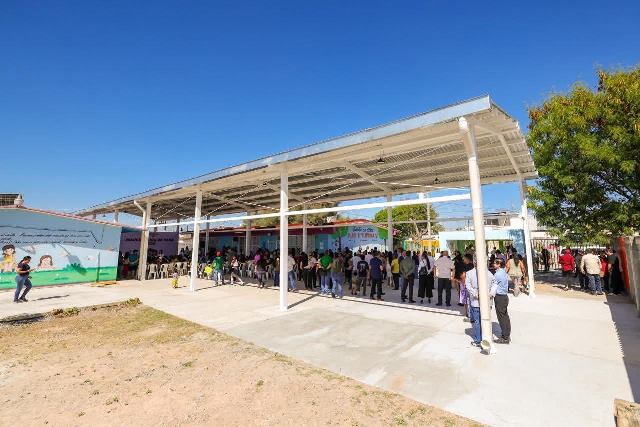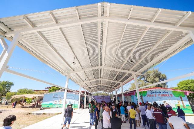 Reynosa, Tam (11-Noviembre-2025).- Una Techumbre Metálica de 296 metros cuadrados, del Programa de Obra Pública Más Grande en la Historia de Reynosa, inauguró el Alcalde Carlos Peña Ortiz para beneficio de más de 500 alumnos del jardín de niños Juan B. Tijerina Villarreal, de Villa Florida, a donde acudió acompañado por su esposa Alejandra Yelitza Garza, Presidenta del Voluntariado DIF-Reynosa.
