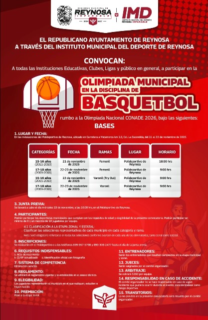 Reynosa, Tam (11-Noviembre-2025).- El Alcalde Carlos Peña Ortiz hace una atenta invitación a todas las instituciones educativas, clubes, ligas y al público en general, a participar en la Olimpiada Municipal en la disciplina de Basquetbol, rumbo a las Olimpiadas Nacionales CONADE 2026, a través del Instituto Municipal del Deporte.