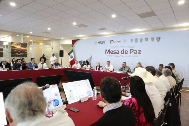 Al presidir la sesión itinerante de la Mesa de Paz, acompañado por la presidenta del Sistema DIF Estatal, doctora María de Villarreal, en las instalaciones de la Expo Tampico, en donde también asistieron integrantes de la Mesa Ciudadana de Seguridad y Justicia, el mandatario estatal expresó que esta reunión de trabajo es un ejemplo de la unión y participación que se tiene en Tamaulipas para lograr mejores oportunidades y tiempos de solución de los problemas.