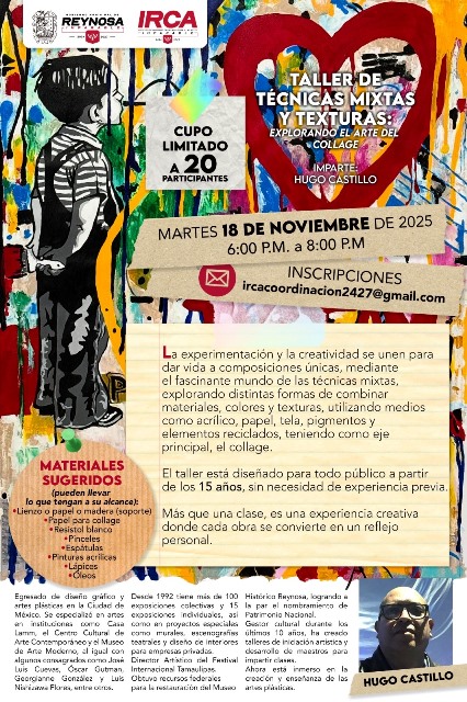 Reynosa, Tam (12-Noviembre-2025).- Por instrucciones del Alcalde Carlos Peña Ortiz, el Instituto Reynosense para la Cultura y las Artes convoca al Taller de Técnicas Mixtas y Texturas “Explorando el Arte del Collage”, impartido por el artista Hugo Castillo.