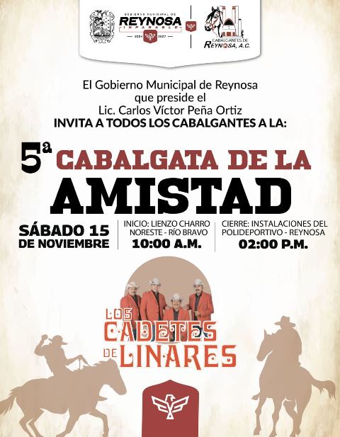 Reynosa, Tam.- El Gobierno Municipal de Reynosa, que encabeza el Alcalde Carlos Peña Ortiz, invita a todas y todos los cabalgantes a la Quinta Edición de la Cabalgata de la Amistad, celebrando la tradición y el orgullo del Norte de Tamaulipas.