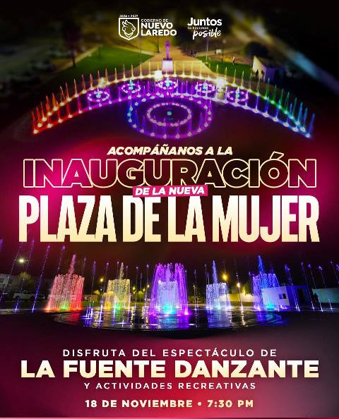 Nuevo Laredo, Tam (14-Noviembre-2025).- El Gobierno Municipal de Nuevo Laredo hace una invitación abierta a todas las familias de la ciudad para asistir a la gran inauguración de la Plaza de la Mujer, un nuevo espacio público que destaca por ser el primero en la ciudad diseñado con perspectiva de género. El evento se llevará a cabo el martes 18 de noviembre a las 7:30 de la noche.