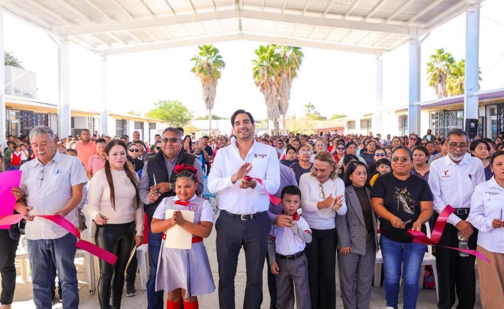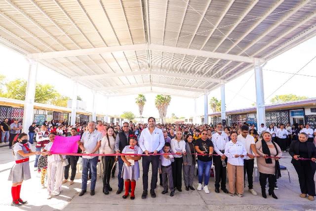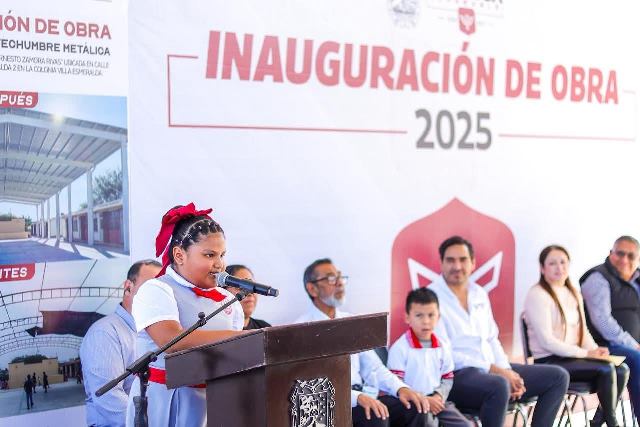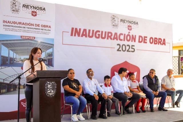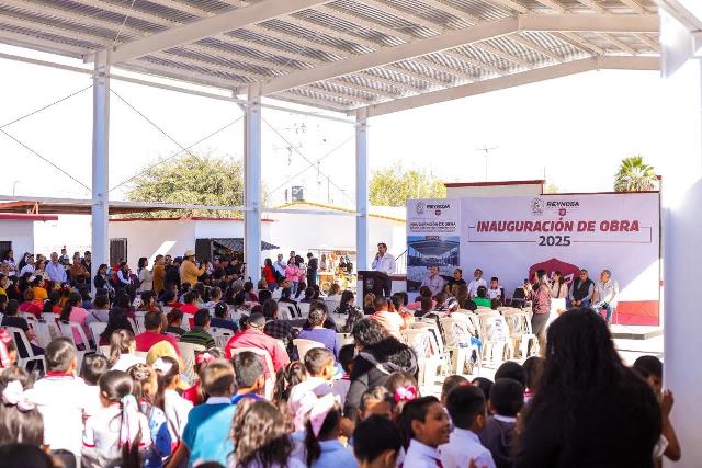 Reynosa, Tam (15-Noviembre-2025).- «Estamos de fiesta el día de hoy con los padres de familia, inaugurando esta techumbre para que los niños y niñas de esta noble institución puedan llevar a cabo sus actividades sin importar el solazo que tenemos aquí en esta región del norte de Tamaulipas», dijo con entusiasmo el Alcalde de Reynosa, Carlos Peña Ortiz, quien además anunció la pavimentación de una calle lateral a la escuela primaria Julián Ernesto Zamora Rivas, de la colonia Villa Esmeralda.