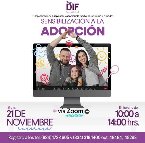 Nuevo Laredo, Tam (18-Noviembre-2025).- El Sistema DIF Nuevo Laredo invita a las y los ciudadanos interesados en participar en el Curso de Sensibilización a la Adopción, que será impartido por el DIF Tamaulipas el próximo 21 de noviembre, en un horario de 10:00 a 14:00 horas, a través de la plataforma Zoom.