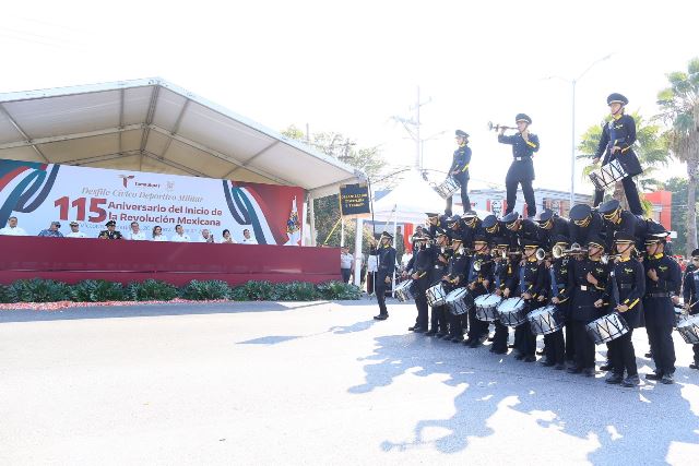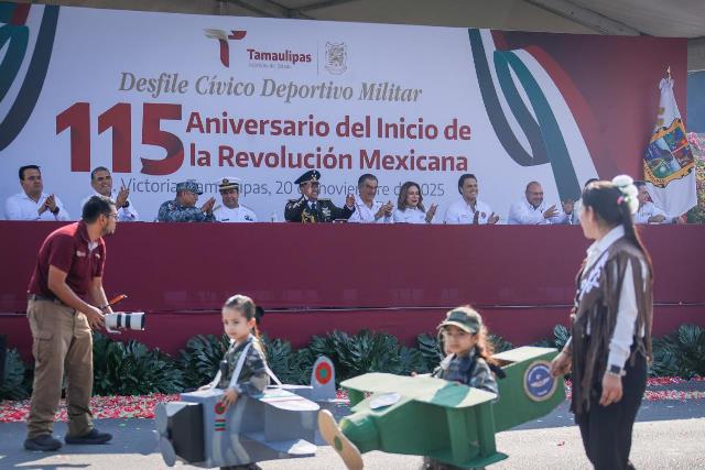 Ciudad Victoria, Tamaulipas (20-Noviembre-2025).- Con la presentación, por primera vez, de una banda de guerra monumental integrada por 500 alumnos y alumnas de diferentes municipios, este jueves se conmemoró el desfile cívico, deportivo y militar, con la entusiasta participación de estudiantes, jóvenes, niñas y niños, en conmemoración del 115 aniversario del inicio de la Revolución Mexicana, presidido por el gobernador Américo Villarreal Anaya.