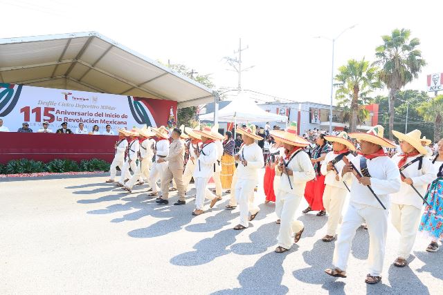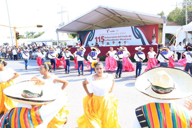 En un marco lleno de folclor, música tradicional mexicana, majestuosos vestuarios y mucho colorido, con representaciones de los caudillos revolucionarios, bailables y tablas gimnásticas, también desfilaron a lo largo del bulevar Tamaulipas 255 integrantes del Ejército Mexicano, Fuerza Aérea y Guardia Nacional, y 724 elementos de la Guardia Estatal, haciendo un total de más de 3,500 participantes.