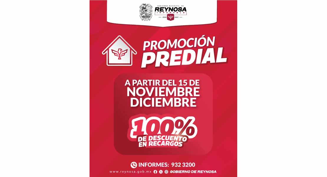 Reynosa, Tam (21-Noviembre-2025).- El Gobierno del Presidente Carlos Peña Ortiz ofrece la promoción en el Impuesto Predial, del 100% de condonación de recargos durante noviembre y diciembre, descuento que puede ser obtenido en las cajas de Finanzas y Tesorería, oficinas foráneas de COMAPA, cajeros automáticos del Ayuntamiento y página web del Municipio.