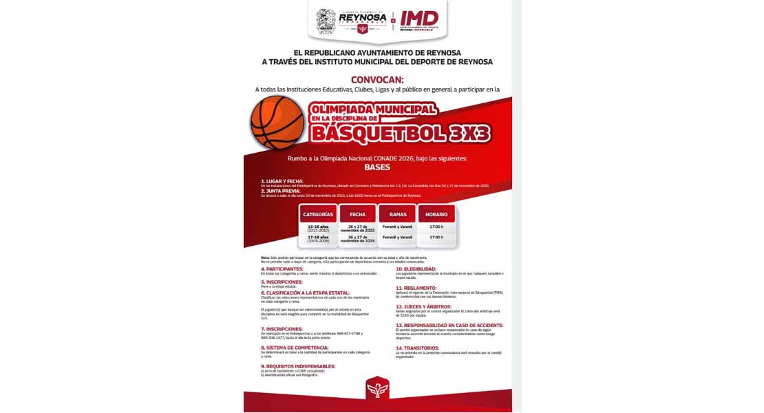 Reynosa, Tam (21-Noviembre-2025).- El Alcalde Carlos Peña Ortiz invita a todas las instituciones educativas, clubes, ligas y al público en general a participar en la Olimpiada Municipal en la disciplina de Basquetbol 3×3, rumbo a la Olimpiada Nacional CONADE 2026, con el objetivo de impulsar el talento deportivo local.