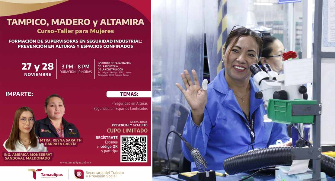 Tampico, Tamaulipas (21-Noviembre-2025).- La Secretaría del Trabajo y Previsión Social de Tamaulipas anunció la realización del Curso-Taller para Mujeres “Formación de Supervisoras en Seguridad Industrial: Prevención en Alturas y Espacios Confinados”, dirigido a mujeres de Tampico, Ciudad Madero y Altamira que buscan profesionalizarse y fortalecer sus competencias dentro del sector industrial.