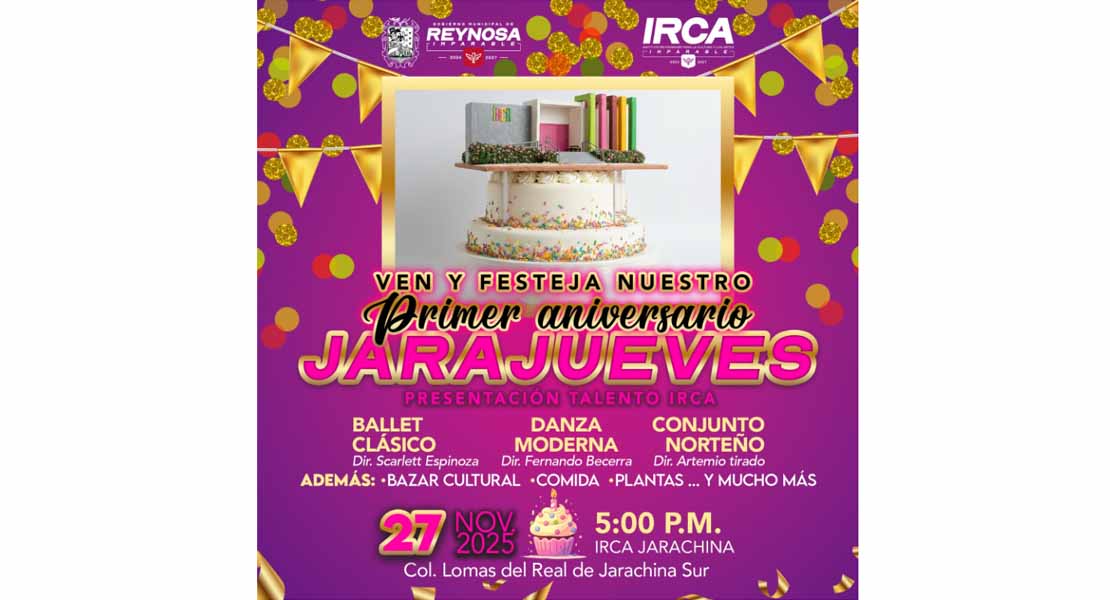 Reynosa, Tam (22-Noviembre-2025).- El Gobierno de Reynosa, que preside el Alcalde Carlos Peña Ortiz, invita al público a festejar el primer aniversario del Jarajueves, una iniciativa cultural que ha dado vida a las tardes del último jueves del mes en el Instituto Reynosense para la Cultura y las Artes sede Jarachina.