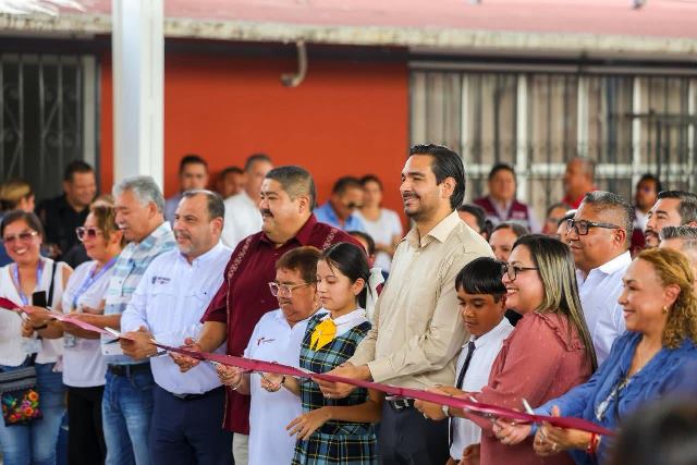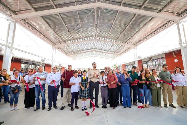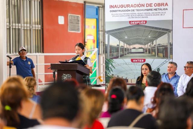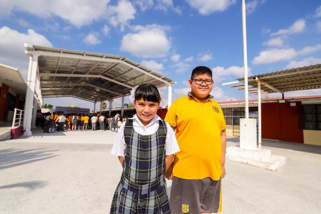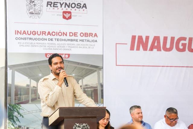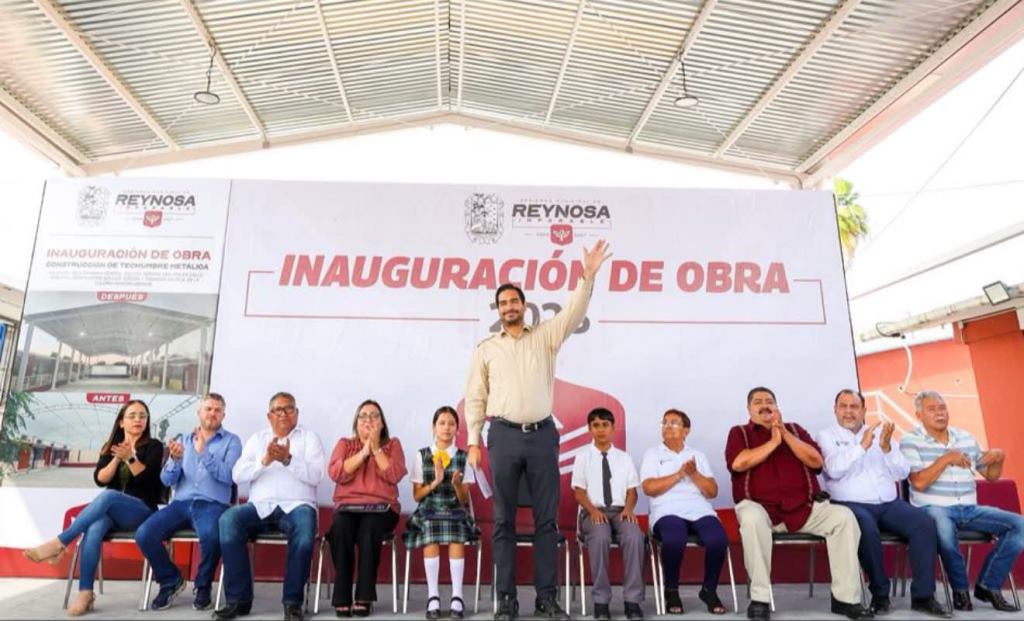 Reynosa, Tam (23-Noviembre-2025).- Inaugurando la Techumbre Metálica en la escuela primaria Aquiles Serdán, de la colonia Rancho Grande, el Presidente Municipal Carlos Peña Ortiz, fue recibido por la Directora Wendy Roxana Castro Lores y los alumnos Briana Camila González Cruz y David Alarcón Rincón.