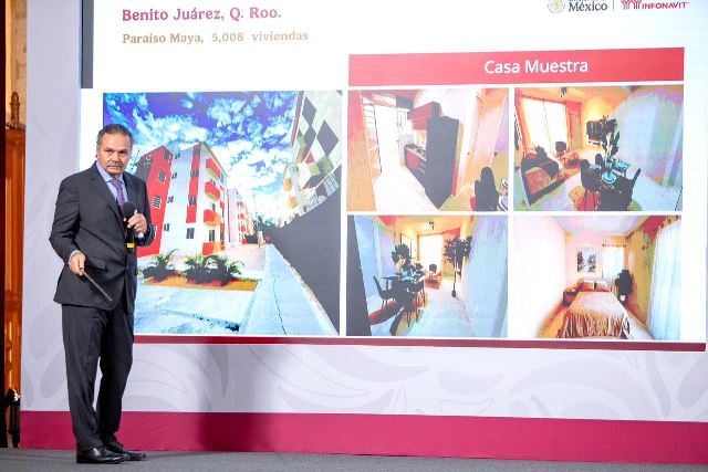Mostró fotografías de desarrollos con viviendas terminadas y amuebladas en diferentes entidades. Se trata de viviendas dignas, de al menos 60 metros cuadrados, que se entregan con todos los servicios y están cercanas al transporte, escuelas, comercios y hospitales.