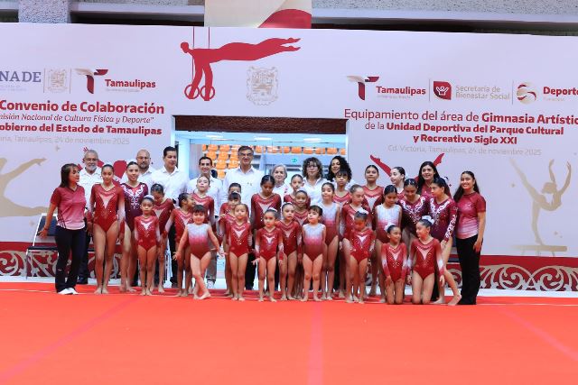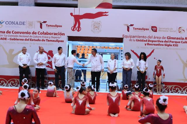 Ciudad Victoria, Tamaulipas (25-Noviembre-2025).- En el marco de la reinauguración del área de Gimnasia Artística de la Unidad Deportiva Siglo XXI, el director general de la Comisión Nacional de Cultura Física y Deporte (Conade), Rommel Pacheco, y el gobernador Américo Villarreal Anaya firmaron un Convenio de Colaboración para impulsar la promoción y el desarrollo de programas y acciones que fomenten actividades físicas y deportivas.