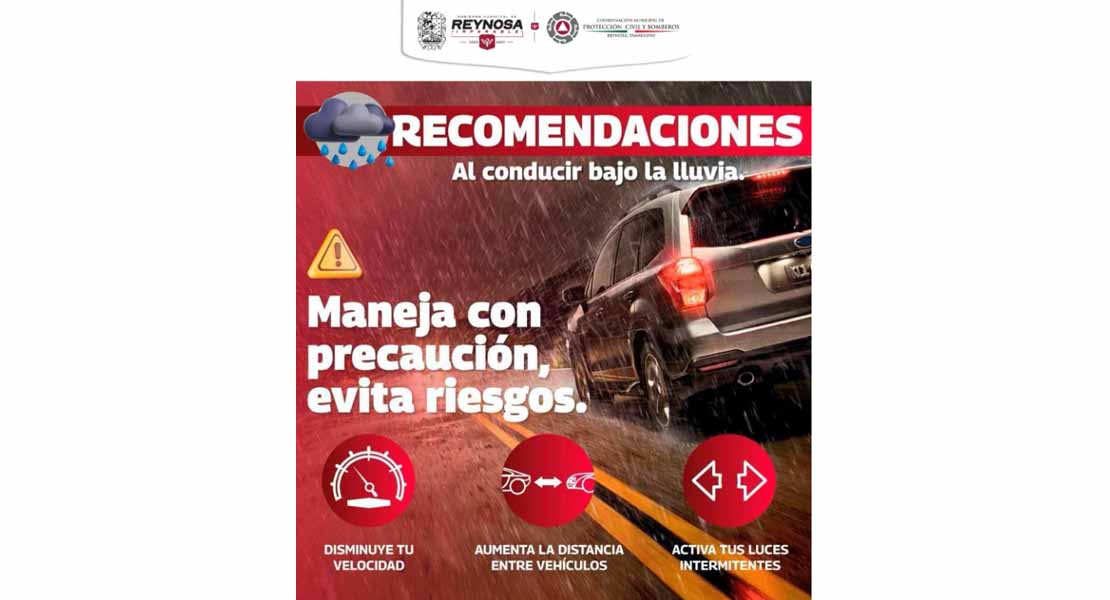 Reynosa, Tam (26-Noviembre-2025).- La Coordinación de Protección Civil y Bomberos de Reynosa recomienda a los conductores manejar con extrema precaución debido a las condiciones climáticas actuales.